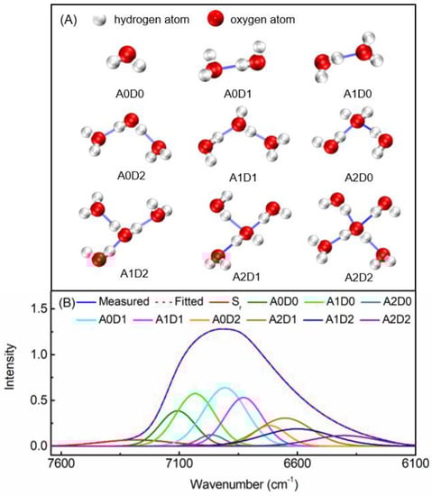 Nine water structures (A), and the results of Gaussian fitting for the NIR spectrum of water in the range of 7650–6100 cm−1 (B).