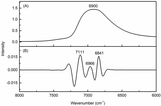 CWT has been proved to be an effective method to resolve overlapping NIR spectral peaks. With the help of the method, the resolution of NIR spectrum can be significantly improved [18,24,40,55,56]. Furthermore, combining CWT with different chemometric methods, such as PCA [63], independent component analysis (ICA) [64], and Gaussian fitting [55,56,57], the spectral features of water structures with different hydrogen bonds were obtained. Figure 3A shows an NIR spectrum of water in the spectral range of 8000–6000 cm−1. There is only a broad peak around 6900 cm−1, which corresponds to the first overtone of OH stretching. It is difficult to obtain information about the structures of water directly from the spectrum. To enhance the resolution of the spectra, CWT can be adopted. Figure 3B shows the transformed spectra of water by CWT. Three peaks at 7111, 6966, and 6841 cm−1 were obtained, which can be assigned as vibrational of non–hydrogen–bonded (NHB), weakly hydrogen-bonded (WHB), and strongly hydrogen–bonded (SHB) OH in a water molecule, respectively.