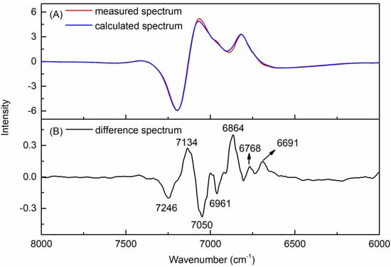 To obtain more detailed information on water structures from the NIR spectrum, a chemometric method based on the rotation of the loadings in PCA was proposed [65]. The method uses CWT to enhance the resolution of the spectra, and further analyzes the transformed spectrum by PCA. When PCA is performed on the spectral data of a binary water–ethanol mixture, for example, the loadings obtained by PCA are combinations of the spectra of the two components. Therefore, through the rotation of the loadings, the spectrum of water in the mixture can be obtained, which is more reliable to reflect the structure of water in the mixture. Furthermore, the difference spectrum between the spectra of pure water and the calculated one can be used to analyze the structure change of water when it is mixed with another compound. Figure 4A shows the transformed NIR spectrum of pure water and the calculated spectrum from that of water–ethanol solution, and Figure 4B shows the difference between the two spectra. It is interesting that seven peaks were found, including the negative peaks at 7246, 7050, and 6961 cm−1 and the positive peaks at 7134, 6864, 6768, and 6691 cm−1. These peaks, in the sequence of higher to lower wavenumber, may correspond to the rotation vibration (Sr) of free OH and the OH in water structures with hydrogen bonds of different numbers or strengths. More interesting is that three negative peaks emerge in the higher wavenumber range of the spectrum, but three positive peaks emerge in the lower wavenumber range. The result clearly indicates that water structures with less or weaker hydrogen bonds becomes into that with more or stronger hydrogen bonds when ethanol is added to water.