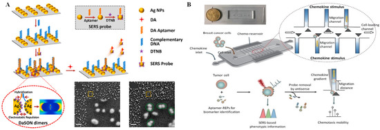 Raman scattering is another common optical phenomenon that has a high sensitivity and causes less photobleaching compared with fluorescence. When a molecule irradiated by an incident light that may be absorbed, scattered, or passed straight through and the photon energy does not match to the energy gap between the ground state and the excited state of the molecule, inelastic scattering of the photon occurs [45]. Raman spectroscopy has an advantage, as it can achieve non-destructive measurement of almost all optically accessible samples without a sample pretreatment process. However, for a long time, the lower sensitivity of Raman scattering due to the poor efficiency of the inelastic scattering process inhibited its wide application—until the advent of SERS technology, which overcome the aforementioned limitation. In SERS, the scattering signal of molecules located near nanometric metallic structures can be significantly enhanced by more than a million times [46]. Over the past 40 years, SERS has evolved into a simple but efficient technique for ultrasensitive identification of analytes in various complex samples [47]. The implementation of SERS on microfluidic chips is popular, as high repeatability and stability can be obtained by this integrated platform. Li et al. [48] designed a microfluidic SERS biosensor that can monitor the release of dopamine from living cells in situ with ultra-high sensitivity and reliability (Figure 2A). SERS probes were formed by Ag nanoparticles (AgNPs) in combination with 5,5′-Dithiobis-(2-nitrobenzoic acid) (DTNB, acting as a Raman reporter) and dopamine aptamers. In addition, AgNPs labeled with dopamine aptamer-complementary DNA strands were self-assembled on a glass slide through electrostatic force. When the electrostatic repulsion and the base pairing between the abovementioned AgNPs and SERS probes achieved equilibrium, the DNA-assisted synthesis of zipper-like orthonanodimers (DaSON) was achieved. The DaSON-based SERS sensor was decorated onto a microfluidic chip containing a cell culture unit, as well as a detection unit, so in situ monitoring of dopamine release from living PC12 cells could be realized by SERS signals. Recently, using a SERS-integrated microfluidic chip, Zhang et al. [49] realized the 2D profiling of tumor chemotactic and molecular phenotypes at the single-cell level. In this assay, the chemotactic properties of individual cancer cells were estimated by cellular migratory behavior in the microfluidic channel. Multiplex SERS probes were synthesized by gold@silver core-shell nanoparticles (Au@Ag REPs) decorated with a Raman reporter and the DNA aptamers targeting various phenotype surface proteins. These synthesized SERS probes can monitor the protein expression of single tumor cells by different SERS signals in the microfluidic channel (Figure 2B).