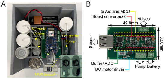 The key feature of the sensor system is the ability to perform automatic sensor calibrations at low cost and in a small form factor. The fully assembled sensor system is shown in Figure 2A. The 3D-printed enclosure is approx. 8 cm square, and about 5 cm deep; however, the size of the enclosure is primarily driven by the size of the used fluid reservoirs and a much more compact arrangement should be possible, especially with lower volume or external fluid compartments. Instead of relying on external fluid control instruments that are usually bulky and expensive, we integrated flow-control modules into the custom PCB circuit (Figure 2B). The motor driver controls the pump speed via pulse-width modulation (PWM). The boost converters control the switching of valves by stepping up voltage input (+3VDC) to the rated voltage of solenoids (+12VDC) while featuring output disconnect during shutdown to save power. Miniaturized peristaltic pump and solenoid valves were selected due to their compact sizes and lower costs than common syringe pumps and rotary valves. While microfluidic pumps and valves have also been widely developed, they increase the total cost of sensor fabrication and tend to suffer leakage issues [17,18].