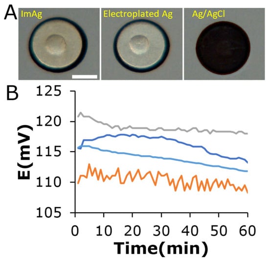 (A) Electroplated Ag/AgCl reference electrode. Photographs (left to right) of the original immersion silver layer of PCB, electroplated silver, and finished Ag/AgCl electrode after chloridization. Scale bar = 0.5 mm. (B) Potentiometric response of Ag/AgCl reference electrodes (n = 4) against commercial silver chloride electrode (Ag/AgCl 3 M NaCl). Electrolyte: 1 mM KNO3 + 10 mM NaCl.