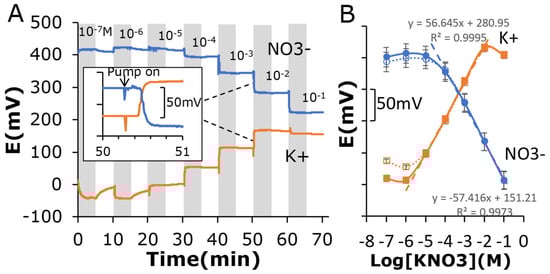 Potentiometric response of the multiplexed sensor (K+ and NO3− electrodes and Ag/AgCl reference) in microchannel under alternating flow (shaded) and static conditions: (A) Real-time sensor response. Flow rate: 0.45 mL/min. Electrolyte: KNO3 + 10 mM NaCl. Inset: enlarged view showing sensor’s response to changing concentration. (B) Calibration curves of the NO3− and K+ ISEs (3 electrodes for each ion). Solid lines indicate flow condition and dashed lines indicate static condition.