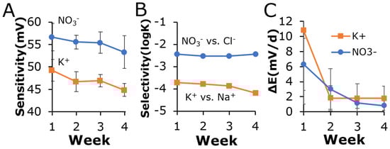 Evaluation of the long-term performance showed that the sensors retained most of their sensitivity (95% for NO3− and 91% for K+ ISEs) after 3 weeks (Figure 5A). The gradual decay may be linked to the leaching or breakdown of membrane ingredients (e.g., plasticizer or ionic sites), which was thought to have also resulted in decrease in sensor conductivity and capacitance [14]. In addition, the sensors have maintained their selectivity over the testing period, with the NO3− ISEs displaying selectivity coefficients of −2.4 to −2.5 (vs. Cl−) and the K+ ISEs of −3.7 to −4.2 (vs. Na +) (Figure 5B). The maintenance of selectivity ensured that the sensors would function properly in complex samples. In terms of baseline (Figure 5C), the sensors showed an average drift of 6–11 mV per day (mV/d) in the first week and have stabilized since then with the drift typically below 3 mV/d. However, even with a drift of 3 mV/d, the error could be as high as 13% for daily measurement. Therefore, the sensors here would need regular calibration in the long term, especially for the first 2 weeks. For calibration-free sensors, drift on the order of μV/h was suggested [10].