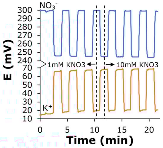 To evaluate the sensor system for in situ measurements, the response of the sensor was measured in an automated two-point calibration (Figure 6). At each step, the sensor was measured for 60 s at default followed by solution switching for 25 s. These parameters were chosen to ensure complete rinsing of the channel while minimizing reagent consumption. The sample volume used for each measurement was ~187.5 μL. As shown in Figure 6, after about two calibrating cycles, both K+ and NO3− sensors showed a highly reproducible response, with the K+ ISEs exhibiting 20.4 ± 0.45 and 68.4 ± 0.45 mV for the last five cycles at 1 and 10 mM KNO3, respectively, and the NO3− ISEs showing 299.1 ± 0.18 and 244.9 ± 0.36 mV. The high reproducibility indicates that the sensor system can robustly perform self-calibration.