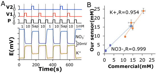 Xylem sap test: (A) Real-time sensor response in a programmed sequence of pump (P) and valves (V1,V2). The sensors were calibrated before and after each sap measurement with KNO3 (1 and 10 mM) + NaCl. (B) Comparison of ion concentrations in original sap between our sensors and commercial ISEs. Sap samples were prediluted 10× with 1 mM KNO3 (+ 10 mM NaCl) for our sensor and 10–20× for commercial ISEs.
