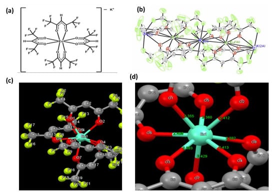 (a) Molecular structure of K[Eu(hfa)4] and three views of its crystal structure, showing: (b) 50% thermal ellipsoids of two adjacent repeat units of the entire structure; (c) ball and stick drawings of a single complex anion unit (hydrogen atoms removed for clarity); and (d) a zoomed view thereof showing the coordination sphere with Eu-O distances labeled in Å units.