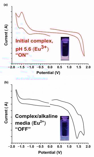 To evaluate the “on–off” emission changes with respect to pH, cyclic voltammetry (CV) studies were performed. Such CV investigations can determine the changes in the oxidation state of the complex at different pH values because Eu(II) from the metal reduction process is known to be non-emissive [46] or weakly emissive specially in methanol medium [47]. Also the oxidation of Eu2+ to Eu+3 is reported in acidic media in aqueous solution [47]. Thus, the CV experiment was performed to confirm the changes in the oxidation state of the Eu(III) metal center from 3+ to 2+, with changes in pH from ~5.6 to 8.0. Figure 3a,b show oxidation and reduction cycles of the initial complex at pH 5.6 and complex in alkaline medium (pH 8), respectively. The initial complex only shows reduction as expected, changing its oxidation state 3+ to 2+ (Figure 3a), while the complex in alkaline medium shows only oxidation (Figure 3b). This shows that the complex in alkaline medium exhibits a lower oxidation state compared to the initial complex, which is +2. This was confirmed by the weak emission detected at 468 nm for the complex in alkaline medium, which is in the signature blue emission region for Eu2+ [48,49,50] (Figure S1). These data suggest that the Eu3+ center undergoes a chemical reduction to Eu2+ in alkaline media, triggering ligand dissociation due to the reduced Columbic attraction. The in situ Eu2+ generation is responsible for the quenched red emission.