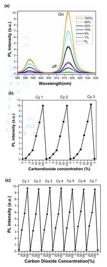 (a) PL spectra of the sensor after exposure to 1%, 5%, 10%, 25%, 50%, and 100% of CO2 in N2. (b) PL peak intensity changes for three purging cycles using 1%, 5%, 10%, 25%, 50%, and 100% of CO2 in N2. (c) PL peak intensity changes for seven purging cycles using 25%, 50%, and 100% of CO2 in N2.