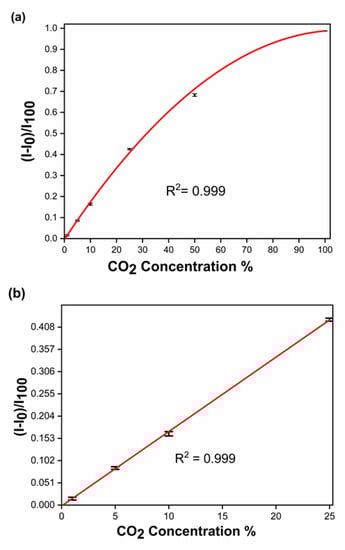 where A is the (I − I0)/I100 value, and the CO2 concentration is in an N2 gas matrix. In a blind study, the equation was tested with different unknown concentrations of CO2 from 1–25% in N2 (Table 1 and Figure S7). The results showed good accuracy and very little variation in the calculated vs. actual concentration for each gas mixture sample tested.