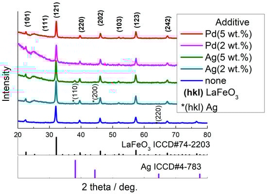 In the present work, gas-sensitive nanocrystalline LaFeO3 with a perovskite-like structure, a crystallite size of 19–28 nm and a BET surface area of 6–8 m2/g was synthesized using the sol–gel method. The materials were modified by Ag and Pd at concentrations of 2–5 wt.%, and the additives were deduced to be in the form of nanoparticles segregated at the surface of LaFeO3. Noble metal additives were observed to be in mixed-valence partially oxidized states: Ag2O/Ag with the predominance of metallic silver in LaFeO3/Ag, and PdO/Pd with the prevalence of oxidized palladium in LaFeO3/Pd. The difference might be due to the lower Ag-O bond energy and, hence, the lower stability of silver oxide in comparison to the Pd-O system []. Additionally, the larger fraction of reduced Ag could be due to the higher annealing temperature of AgNO3-impregnated precursors (400 °C) than that of Pd(acac)2-impregnated ones (300 °C). No incorporation of Ag+ or Pd2+ cations into the lattice of LaFeO3 was deduced in the nanocomposites, since the positions of XRD peaks of LaFeO3 did not shift in the presence of different Ag or Pd concentrations (Figure 1). Moreover, a significant discrepancy in the cationic radii rules out the formation of solid solutions in LaFeO3/Ag or LaFeO3/Pd materials: r(Ag+) = 1.15 Å, r(Pd2+) = 0.86 Å, r(Fe3+) = 0.65 Å, (CN = 6), and r(La3+) = 1.32Å (CN = 12) [].