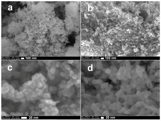 In the SEM images (Figure 2), nanoparticles with average sizes in the range of 20–50 nm were distinguished, which is in agreement with the crystallite sizes of LaFeO3 and Ag estimated by XRD. The morphologies of pristine and modified LaFeO3 samples were represented by isotropically shaped irregular nanoparticles. The nanoparticles were strongly agglomerated into loose three-dimensional aggregates (Figure 2a). The modifiers, which were presumably segregated at the surface of LaFeO3, could not be distinguished in the SEM images (Figure 2b–d), likely because of the close nanoparticle sizes of the perovskite support and of the additives. This agrees with the XRD data on the crystallite size of LaFeO3 and Ag (Table 1). Moreover, the close atomic numbers of Ag and Pd are intermediate between those of La and Fe, and the additives could not be distinguished by contrast from the background of LaFeO3.