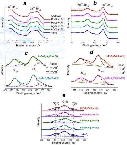 XP spectra of pristine and Ag- or Pd-modified LaFeO3 in the analytical regions of La 3d (a), Fe 2p (b), Ag 3d (c), Pd 3d (d) and O 1s (e).