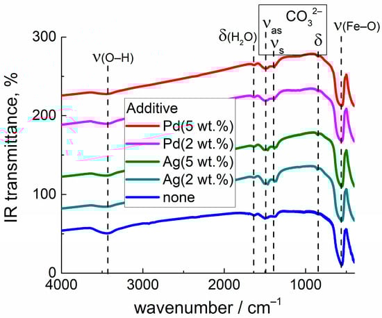 The FTIR spectra of samples are dominated by the Fe-O stretching vibration band at 565 cm−1 related to the perovskite phase of LaFeO3 (Figure 4) []. Minor bands of O-H stretching (3430 cm−1) and H2O bending vibrations (1630 cm−1) were observed due to adsorbed water. The peaks at 1490 cm−1, 1370 cm−1 and 860 cm−1 can be ascribed to monodentate carbonate species because of CO2 adsorption []. The relative intensities of carbonate peaks were a little stronger in the Ag-modified samples in comparison to LaFeO3 and LaFeO3/Pd (Supplementary Data, Figure S2).