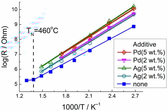 Figure 5 shows temperature plots of the DC resistance of pristine and modified LaFeO3. The materials behaved as semiconductors, and the resistance steadily dropped with rising temperature. Linear relations were observed in the coordinates lgR ~ 1/T, indicating the activation character of conductance. The estimated effective activation energies of conduction are summarized in Table 3. At a temperature of around 450 °C, an inclination was observed on the linear plot of LaFeO3, which can be associated with a change in magnetic ordering. This can be a transition from the antiferromagnetic to the paramagnetic state of LaFeO3, since the Neel temperature TN = 462 °C was reported for lanthanum ferrite [,]. This transition at temperature T > TN is accompanied by a decrease in the activation energy of conduction (Table 3).