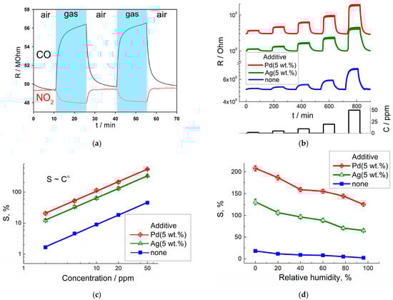 Dynamic sensor response of LaFeO3 to 20 ppm CO and 1 ppm NO2 at 200 °C (a); dynamic response to increasing concentration of CO for LaFeO3 and LaFeO3/Ag(5 wt.%) at 200 °C and for LaFeO3/Pd(5 wt.%) at 150 °C (b); dependence of sensor signals on CO concentration for LaFeO3 and LaFeO3/Ag(5 wt.%) at 200 °C and for LaFeO3/Pd(5 wt.%) at 150 °C (c); sensor signals of LaFeO3 and LaFeO3/Ag(5 wt.%) at 200 °C and for LaFeO3/Pd(5 wt.%) at 150 °C to 20 ppm CO at different relative humidity levels (d).