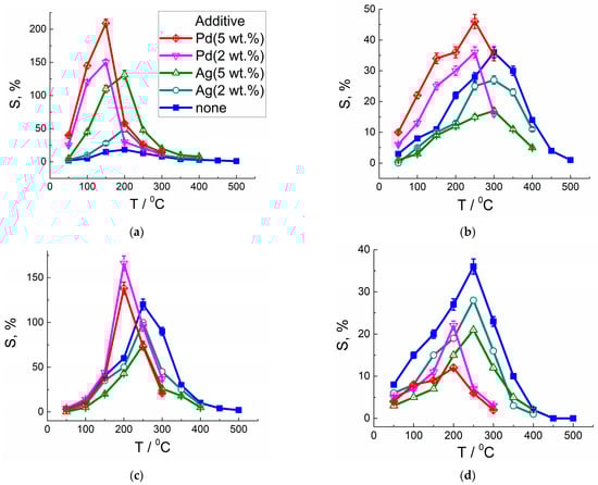 Modification with Ag did not affect the temperature dependences of sensor signals, and the values of sensor signals only changed compared to LaFeO3 (Figure 7). For the Pd-modified sensors, the optimal operating temperatures for sensing all target gases were 50 °C lower relative to pristine LaFeO3. In all cases, the temperature corresponding to the maximum sensor signals of modified sensors was lower than the annealing temperature of LaFeO3/Ag and LaFeO3/Pd. This means that nanocomposites do not have to be continuously heated at high temperatures, which ensures stable and long-term sensor operation under optimal measurement conditions.