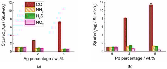 Ratio of maximum sensor signals of LaFeO3/Ag (a) and LaFeO3/Pd (b) to sensor signals of pristine LaFeO3 to CO (20 ppm), NH3 (20 ppm), H2S (2 ppm) and NO2 (1 ppm) at appropriate operating temperatures.