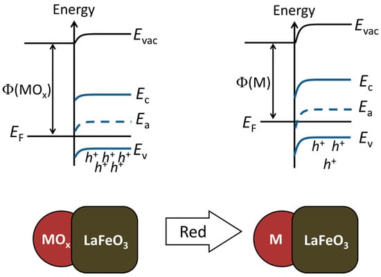 When LaFeO3 was modified by Ag or Pd, the resistance increased with the concentration of the additive. This should be due to the formation of the hole-depleted Schottky barrier at the semiconductor/noble metal interface. The work functions of Ag, Ag2O, Pd, PdO and LaFeO3 are 4.7, 5.0, 4.8, 6.0 and 6.5 eV, respectively [,,,]. When the heterojunction is formed between the p-type LaFeO3 semiconductor and nanoparticles of Ag2O/Ag or PdO/Pd, an electronic transfer would be expected from introducing the additives to LaFeO3. This leads to a decrease in the concentration of holes, which are the charge carriers in lanthanum ferrite, and the formation of a potential barrier for hole conduction. For the sake of simplicity, we assumed metallic behavior for the partially oxidized noble metal additives, and the position of the Fermi energy level is described by the work function between the work function limits of completely oxidized and completely reduced noble metals. According to the Schottky–Mott model of the metal–semiconductor heterojunction, the potential energy barrier for hole conduction arises at the interface, and its height is characterized by the difference EF − Ev. Here, EF is the energy of the Fermi level, which is aligned between the contacting metal and semiconductor, and Ev is the energy of the valence band edge at the surface of LaFeO3, which is 6.8 eV below the vacuum level [].