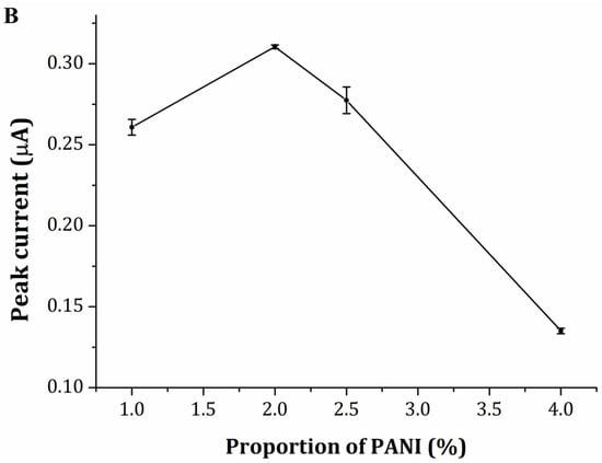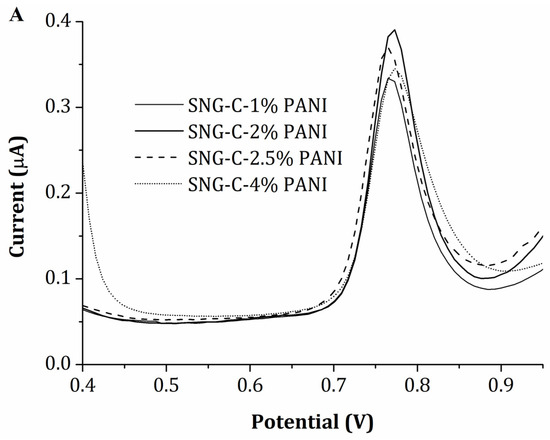 The electrochemical evaluation of Sonogel–Carbon-modified composites was made by means of DPV using a model chlorophenol, namely 4-chloro-3-methylphenol (PCMC). Figure 1A shows the differential pulse voltammograms recorded with carbon–ceramic composites at different proportions of PANI ranging from 1% to 4%. The corresponding differential pulse voltammograms displayed remarkable symmetric oxidation peaks, ascribed to their suitable electrochemical features. Regarding the electrochemical response, the best peak height was achieved at 2% PANI (see Figure 1B) and, hence, this material presents the greatest electrochemical performance for PCMC detection. The low variability of the electrochemical responses provided with this formulation are also noteworthy, and can be directly related to exceptional reproducibility. Therefore, this ceramic–polyaniline formulation, namely SNG–C–2% PANI, was selected for further studies.