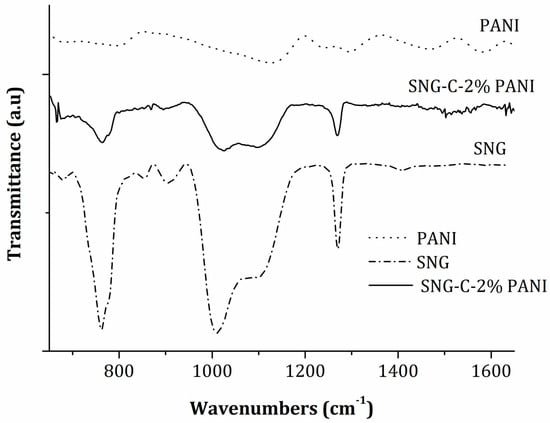 FTIR spectra recorded with different conducting materials: (dotted line) PANI, (dashed line) SNG–C–2% PANI and (solid line) SNG.