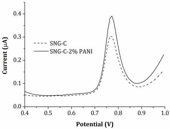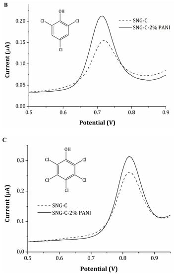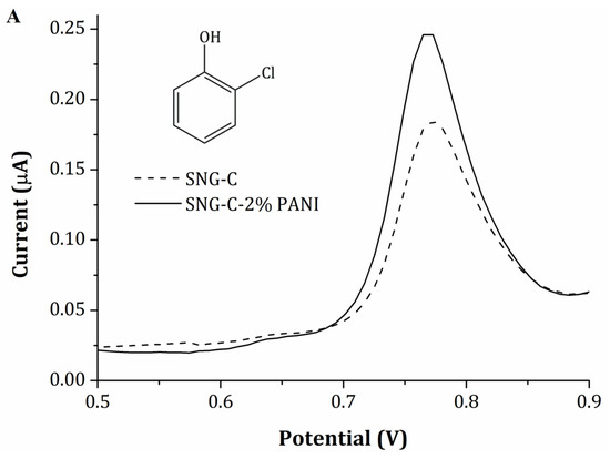 The detection of PCMC, used as a benchmark chlorophenol, was investigated with SNG–C–2% PANI by means of DPV. In order to study the role of the conducting polymer in electrochemical detection, the unmodified electrode (SNG–C) was also used. Figure 3 shows the DPV recorded with both materials in the presence of 10 μM of PCMC in 0.1 M acetic/acetate buffer (ABS) at pH 4 with 0.5 M KCl. The peak height provided with the SNG–C–2% PANI is higher than the one recorded with the bare material, around 25% of the electrochemical response, addressing the superior sensitivity of the modified composite for PCMC detection. This enhancement on the electrochemical response provided by the modified composite may be ascribed to a favorable polymer–analyte interaction.