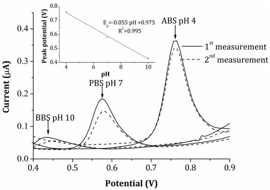 The peak potential shifts with the pH, attributed to the participation of the protons in the redox reaction. The slope between the peak potential and the pH is 55 mV, close to 59 mV (see inset, Figure 4) ascribed to one-proton–one-electron processes [32]. Concerning the electrochemical response, the buffer solution at pH 4 led to the best peak height for PCMC detection. Additionally, no major change in the peak current was observed after performing the second measurement in acid solution. Thus, this medium is selected for electrochemical assays of the target chlorophenol.
