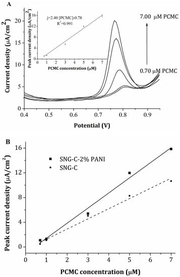 The developed material was employed in the voltammetric determination of PCMC ranging from 0.7 to 7.0 μM using DPV under the instrumental conditions detailed in Section 2. The current densities at different PCMC concentrations (calculated using the geometrical area of the electrode) recorded with the SNG–C–2% PANI composite are plotted as a function of the PCMC concentration (see Figure 5A). The calibration curve considering three measurements at each PCMC concentration value is shown in the corresponding inset. The relationship between the peak current density and the concentration of PCMC can be described by the following equation: j = 2.40 [PCMC] − 0.78 (R2 = 0.991), where j is the current density (expressed in μA/cm2) and [PCMC] is the concentration of the studied analyte (expressed in μM). The sensitivity was determined as the slope of the calibration curve, obtaining 2.40 ± 0.18 μA/cm2. The detection limit (LOD) was calculated by LOD = 3 × Sq/m, where Sq is the standard deviation of the intercept and m is the slope of the linear equation. The value obtained was 0.69 μM.
