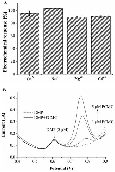 The influence of some typical ion species, i.e., calcium, sodium, magnesium and cadmium salts, on the electrochemical response was examined. Measurements in the presence of 7 μM of PCMC and higher concentration of these salts (100-fold of calcium and sodium salts and 10-fold of cadmium and magnesium ones) were performed by triplicate. The electrochemical response of the device is remarkably similar in presence of the analyte and different salts (see Figure 6A), suggesting a low influence of these compounds in the determination of 4-chloro-3-methylphenol. Moreover, the variation coefficient values are lower than 6% in all electrochemical assays, confirming the repeatability of the electrochemical measurements discussed in the previous subsection and the absence of fouling on the electrode surface. Therefore, no influence of diverse salts on PCMC detection was achieved.