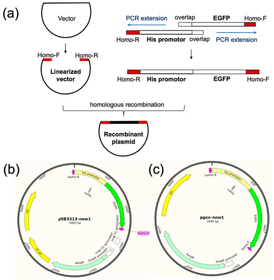 The primers used in this study are listed in Table 2. The EGFP gene was amplified from the pEGFP plasmid using the R1-egfp and egfp-R2 primers. The promoter of the his operon was amplified from the S. Typhimurium SL1344 strain using the R1-his and his-F primers. Linearized vectors, which contained the origin of replication, antibiotic resistance gene, and its promoter, were amplified from the pGEX-6p-1 plasmid (higher copy number) using the pgex-homo-F/R primers and from the pSB3313 plasmid using the pSB3313-homo-F/R primers. The PCR reaction was performed using high-fidelity PrimeStar DNA polymerase, with an annealing temperature of 56–58 °C, extension temperature of 72 °C, and extension time of 1 min per 1000 base pairs. After the PCR reaction, the products were separated and purified using agarose gel electrophoresis, and the target DNA fragments were recovered using a DNA agarose gel recovery kit.