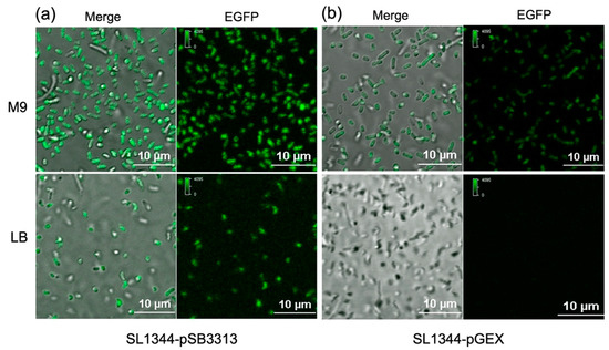To assess the responsiveness of the developed bacterial fluorescence sensor to varying histidine concentrations, both strains were cultured at 37 °C for 30 min in M9 medium (histidine-free) and LB medium (rich in histidine, 1 mM), respectively. The fluorescence intensity of both strains in the M9 medium was significantly higher compared to that in the LB medium. This observation indicates that in the absence of histidine, the promoter of the his operon in the plasmid was effectively activated, leading to the expression of the reporter gene EGFP (Figure 3). Importantly, it is noteworthy that the two bacterial fluorescence sensors, with different plasmids featuring distinct copy numbers, exhibited diverse responses to the histidine levels in the growth medium. The high-copy-number SL1344-pGEX strain displayed minimal fluorescence in the histidine-rich LB medium, whereas it demonstrated strong fluorescence in the histidine-free M9 medium, highlighting its heightened sensitivity to histidine deprivation within the cellular growth environment.