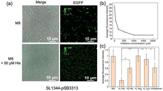 Histidine exists in two main stereoisomers: L-histidine and D-histidine. L-histidine is the more prevalent form in nature and is widely present within organisms [28]. To assess the response capability of the constructed bacterial fluorescent sensors to histidine concentrations, we cultivated SL1344-pSB3313 in an M9 medium with varying L-histidine levels. Figure 4a shows a notable decrease in fluorescence intensity with the addition of 50 μM L-histidine. To quantitatively evaluate EGFP expression under different L-histidine concentration conditions, we determined the bacterial quantity based on OD values and then used ultrasonic lysis to disrupt bacteria, measuring the fluorescence intensity at 488 nm excitation [29]. The average fluorescence intensity displayed an exponential decrease as the L-histidine concentration increased from 0 to 1000 μM (Figure 4b). Within the range of 0 to 200 μM, the fluorescence decay rate was notably rapid. As the L-histidine concentration further increased, the fluorescence gradually declined to background levels. The EC50 of SL1344-pSB3313 was calculated to be ~200 μM.