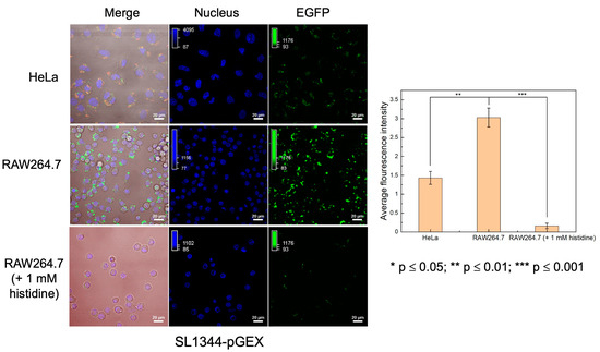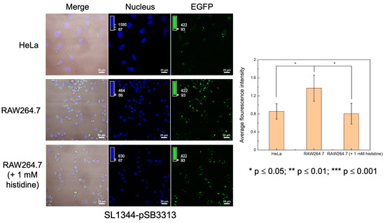 We also conducted tests involving the infection of RAW264.7 macrophage cells and HeLa epithelial cells using the SL1344-pSB3313 sensor. As illustrated in Figure 7, the SL1344-pSB3313 sensor also demonstrated notably elevated EGFP expression in macrophages with lower histidine concentrations while displaying subdued fluorescence signals in HeLa cells. Upon introducing 1 mM L-histidine into the macrophage culture, a significant decrease in EGFP expression by the bacterial sensor was also observed. In contrast to SL1344-pGEX, the SL1344-pSB3313 sensor features a broader histidine response range, thereby facilitating enhanced differentiation among cellular environments with varying histidine levels, including both higher and lower concentrations.