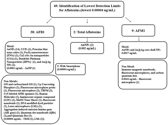 The information was gathered by using Science Direct. An advanced search was conducted using keywords such as lateral flow assay, lateral flow immunoassay, lateral flow immunochromatographic strips, rapid antigen biosensing strips, immunoassay-based lateral flow, lateral flow, lateral-flow immuno-dipstick, and aflatoxin or aflatoxins detection, in order to find articles that closely aligned with the research objective. Figure 1 shows a comparison of 49 research publications to ascertain the lowest LOD for total aflatoxins, aflatoxin M1 (AFM1), and aflatoxin B1 (AFB1). Readers should note that some research studies created more than one LFIA strip and employed multiple particle types.