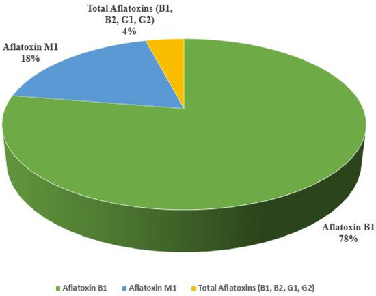 According to the Food and Drug Administration (FDA) in the US, mycotoxin contamination in food and feed leads to direct economic losses of as much as USD 932 million each year. Mycotoxins have infected almost 60–80% of crops worldwide [2], which exceeds the limit set out by the Food and Agriculture Organization (FAO) of the United Nations. Mycotoxin-induced food-safety issues have been particularly severe in developing countries, where they have resulted in widespread fatalities. These harmful compounds are capable of causing birth defects, cancer, and genetic mutations. Cases of mycotoxin contamination causing mass death, have been documented in countries such as England in 1960, Kenya in 2004, and South India in 1995, leading to the deaths of hundreds of people [3]. More than three hundred and thirty-nine species and four subgenera belonging to the genus Aspergillus are responsible for the production of mycotoxins [3]. Aflatoxins are a type of mycotoxin produced by Aspergillus sp. [4]. Aspergillus was reportedly responsible for the production of four major types of aflatoxin: (1) aflatoxin B1, (2) aflatoxin B2, (3) aflatoxin G1, and (4) aflatoxin G2. The derivatives of aflatoxin B1 and aflatoxin B2 are aflatoxin M1 and aflatoxin M2, respectively, which are found in animal milk and urine [5].
