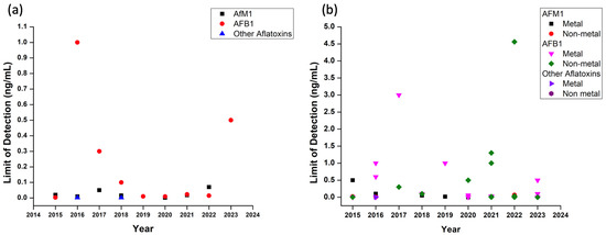 Timeline of the limits of detection of aflatoxins and types of material. (a) Different types of aflatoxin (AFM1—black rectangle, AFB1—red circle, and other aflatoxins—blue triangle); (b) types of material used in detecting aflatoxins through lateral-flow assays.