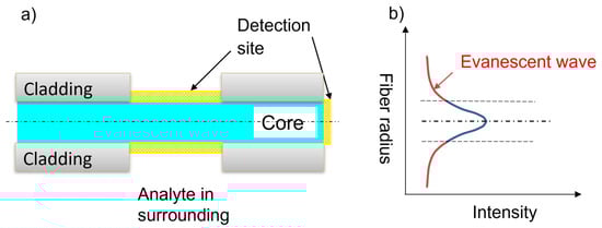 In FO sensors, optical fibers are employed as detection elements. In optical fibers used in telecommunications, EM radiation is guided in special EM waves and guided optical modes, mainly in fiber cores (see Figure 1b) []. However, these EM waves also penetrate fiber claddings at distances of 500–1000 nm. The part of the guided mode in the cladding is called an evanescent wave. The electrical intensity of the evanescent wave exponentially decreases with the distance from the core/cladding boundary. In addition to the guided modes, there are cladding modes propagating in the cladding, usually on short lengths.