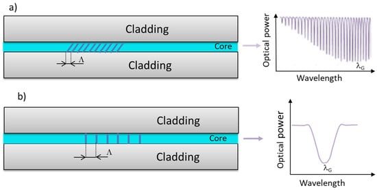 Schemes of the principal structure and output spectrum of (a) tilted fiber Bragg grating and (b) long-period grating. Λ: grating period and λG: principal grating wavelength.