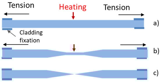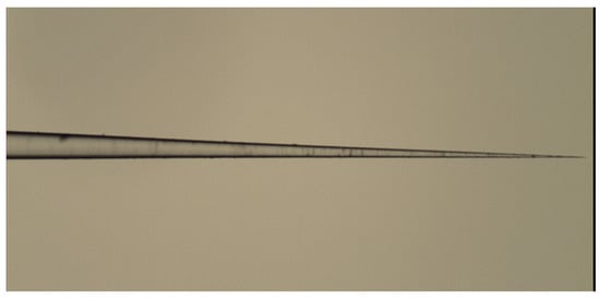 The thermal pulling technique is schematically described in Figure 3. The technique uses a heat source, gas torch, or CO2 laser that heats a bare part of a fiber element while tension is applied along the major axis of the element. The fiber is fixed in clamps so the applied tension can be controlled. By heating silica glass fibers at temperatures above 1600 °C, viscous flows in glass are induced. These flows and the glass surface tension, together with the applied external tensions, cause a decrease in the diameter of the bare fiber part and fiber elongation. A biconical taper is produced at first (see Figure 3b). This taper has a short central part, the waist, with a constant diameter. By continuing the heating, the taper is broken, and two fiber tips are produced (see Figure 3c). By controlling the heating temperature, the tensions applied to the element, and the heating duration, fiber tips with minimum apex diameters of approximately 20 nm can be fabricated by this technique []. The thermal pulling process is rapid (~3 s) and produces smooth tips. It is not very reproducible with respect to tip apex diameters and taper cones. It can be realized on a commercially available micropipette puller, which is relatively expensive. An example of a fiber tip produced by the thermal pulling of a silica fiber with an outer diameter of 125 µm to a microtip taper of 0.6 µm in diameter is shown in Figure 4. Such tapers have been fabricated at the author’s laboratories on a laboratory thermal-pulling device.