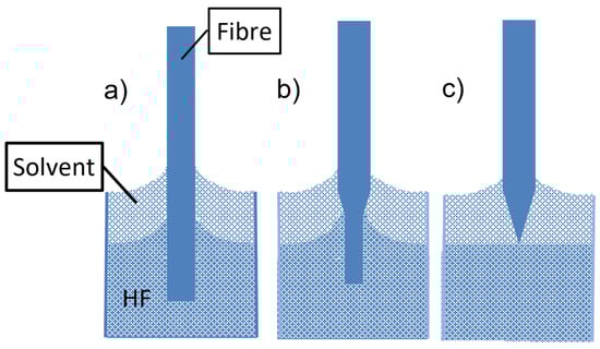 Two different types of the chemical etching method have been reported. The first one is Turner etching [,]. This etching is schematically illustrated in Figure 5. It uses an etchant, i.e., an aqueous solution of hydrofluoric acid (HF), and a protective organic solvent that is immiscible with the HF solution (e.g., oil and toluene). These liquids form two phases in a container (see Figure 5). When a bare fiber is dipped into the container, the etchant forms a meniscus with an initial height due to capillary elevation (Figure 5a). As etching proceeds, the meniscus height decreases progressively due to the reduction in the fiber diameter (Figure 5b). This decrease leaves the etched part in contact with the organic solvent. The etching process stops when the fiber part below the solvent is completely etched, forming the tip (Figure 5c). This technique can produce fiber tapers with large taper angles, which increases the radiation power reaching the tip apex. Tip diameters are comparable with those of thermal pulling. Tips exhibit smooth surfaces. However, due to temperature fluctuations and fiber vibrations, the reproducibility of this technique is not high, and tip dimensions can vary from batch to batch.