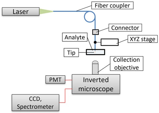 A principal set-up used for measuring with fiber nanotip sensors is schematically shown in Figure 7. A more specific description of such a set-up can be found elsewhere []. The main part of the set-up is an inverted fluorescence microscope with a detector such as a photomultiplier tube (PMT) or avalanche photodiode for intensity measurements, a spectrometer for spectra measurements, and/or a CCD camera for target imaging. Dichroic mirrors, filters, and objectives are other parts of the microscope. A fiber nanotip sensor is fixed on a three-way X,Y,Z translational stage, making its precise insertion into a sample possible. Radiation from a laser is launched into the sensor using a fiber coupler. It excites the fluorescence of a transducer immobilized on the sensor nanotip. The emitted fluorescence signal and remaining excitation radiation are collected by the microscope collection objective. The rest of the excitation radiation is filtered out by a notch filter, and fluorescence is detected by PMT or by spectrometer. In this set-up, fluorescence signals emitted in the direction of the tip axis are detected. One can also find another experimental set up used for sensing with fiber-optic nanotip sensors []. In the set-up, fluorescence emitted from the sensor nanotip is registered in the direction perpendicular to the tip axis. The fluorescence is collected by a GRIN lens coupled with a multimode optical fiber. The excitation radiation scattered from the tip apex is also filtered out in this set-up.
