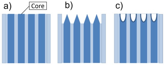 The same guiding mechanism as in standard optical fibers occurs in microstructure fibers, i.e., fibers fabricated from one material (e.g., silica) but with air holes in the cladding [,]. These holes decrease the average refractive index of the cladding bellow that of the solid core. On the other hand, the photonic band gap guiding mechanism can be found in hollow-core crystal fibers (HCPCF) []. Such fibers consist of a large air core surrounded by the cladding of a periodic grid of air holes or a grid of periodically alternating high- and low-index thin layers. Such grids exhibit the photonic band gap at certain wavelengths, due to which radiation in the fiber is confined to the air cores.