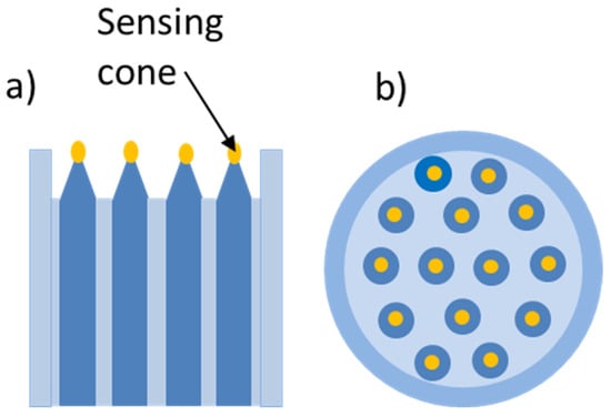 Fiber-optic nanoarrays, as well as microarrays, are often based on fiber bundles such as those used in imaging fibers for medical endoscopes [,]. By fabricating a sensing array on the distal face of an imaging fiber, it is possible to employ it both for imaging and sensing []. Imaging bundles usually consist of a few thousand constituent optical fibers. Each constituent fiber has a core that is surrounded by a thin cladding (see Figure 8). Characteristic optical modes are guided in each fiber core and transmit optical information. There are two types of fiber arrangements in a fiber cable: ordered (coherent) and random. The ordered fiber bundles enable remote locations to be viewed. Such bundles are used for imaging and sensing. The randomly arranged bundles are used for illumination.