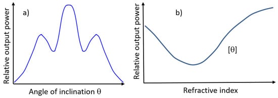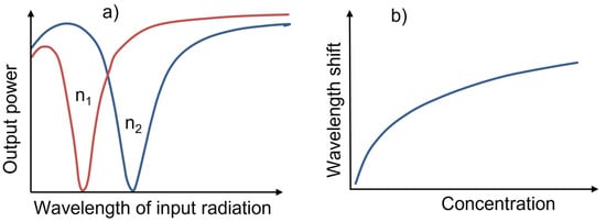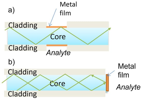 It is necessary to note that refractometric FO sensors based on silica and plastic fibers can be employed for the detection of refractive indices higher than approximately 1.4. Thus, they are not suitable for refractive-index sensing in aqueous solutions, which is important for biology and medicine. This refractive-index limitation can be overcome using a sensing fiber with a nanometer-scaled metallic layer applied onto the core/cladding boundary. Such layers can be found in FO sensors employing surface plasmon resonance (SPR) [,]. The SPR phenomenon is related to the excitation of surface plasmons (SPs) in free electrons moving at the layer surface by evanescent waves of optical modes propagating in the fiber core. Excitation conditions depend on the refractive indices of materials in contact with the metallic layer. A similar effect, called localized surface plasmon resonance (LSPR), takes place at the surface of metallic nanoparticles. It has also been used in FO chemical sensors and biosensors []. More about FOSPR sensors can be found in Section 4 of this paper.
