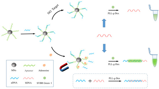 First, 20 µL of MNs-Apt/aDNA was added to 20 µL of adenosine solution and incubated at 37 °C for 60 min. Then, 5 µL of bDNA and 5 µL of PLL-g-Dex were added to 30 µL of supernatant after magnetic separation and then reacted at room temperature for five minutes. Finally, 10 µL of diluted SYBR Green I (5×) was added to the solution of the above reaction, and after shaking, the prepared solution was transferred to a cuvette containing 2 mL of PBS buffer for fluorescence measurement.