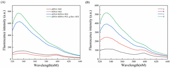 Firstly, in order to verify that PLL-g-Dex can assist aDNA and bDNA to produce longer DNA duplex structures, we performed the following fluorescence tests (Figure 2A). The experiment was conducted at room temperature. When only aDNA or bDNA was present, there was a small amount of fluorescence signal due to some self-pairing of the DNA bases. When both aDNA and bDNA were present, they produced a certain fluorescence intensity due to the base complementarity principle. Under the same experimental circumstances, the fluorescence intensity rose after adding PLL-g-Dex, indicating that PLL-g-Dex could facilitate the hybridization of probes with complementary base sequences and enhance the fluorescence intensity.