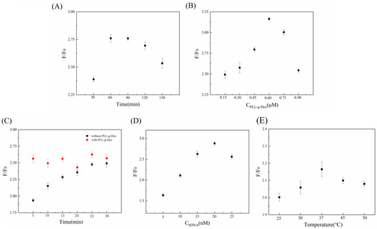 To improve the efficiency and accuracy of the biosensor, this experiment optimized five key factors: the incubation times of the Ad and magnetic nanobead complexes, the concentration of PLL-g-Dex, the incubation times of aDNA and bDNA, the concentration of bDNA, and the temperature. Each experiment had only one variable, and three parallel experiments were performed to reduce the influence of random errors. F denotes the fluorescence signal intensity when the target substance is present, and F0 represents the fluorescence signal intensity when the target substance is not present.