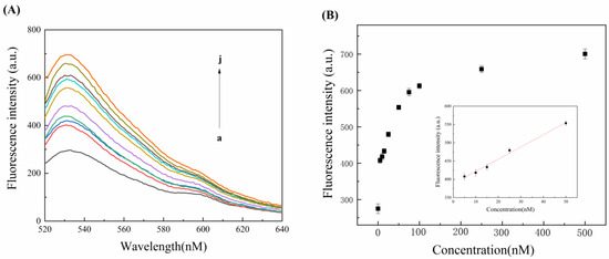 (A) Fluorescence spectra of different adenosine concentrations (a–j: 0 nM, 5 nM, 10 nM, 15 nM, 25 nM, 50 nM, 75 nM, 100 nM, 250 nM, and 500 nM). (B) Graph of the relationship between different adenosine concentrations and fluorescence signal intensity (the inset is a linear calibration curve of adenosine and fluorescence intensity in the range of 0–50 nM). Error bars represent the standard deviation obtained from triplicate experiments.