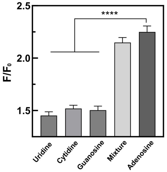 Selectivity of the sensor for uridine, cytidine, guanosine, mixture, and adenosine. The data were expressed as mean ± SDM (n = 3). A one-way ANOVA was used to evaluate the data (**** p < 0.001).