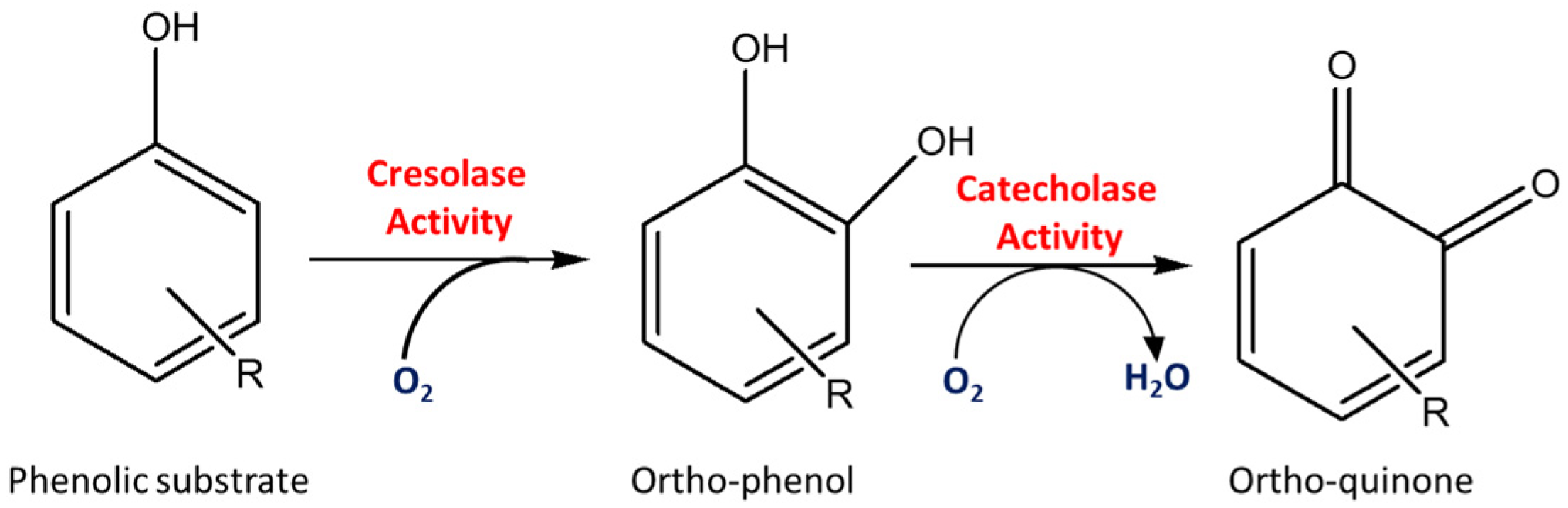 - Solem, E.; Tuczek, F.; Decker, H. Tyrosinase versus Catechol Oxidase: One Asparagine Makes the Difference. Angew. Chemie-Int. Ed. 2016, 55, 2884–2888. [Google Scholar] [CrossRef]